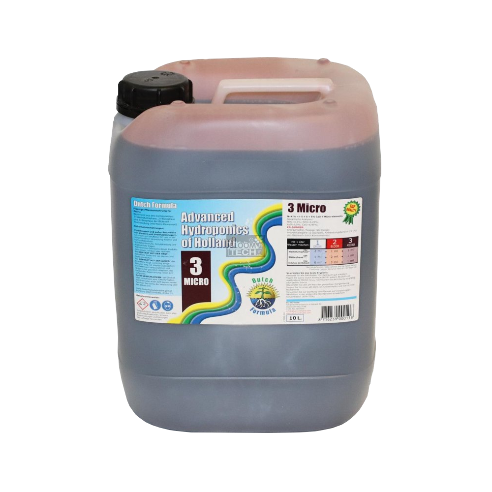 Sie werden sehen, dass MICRO das Erfolgsgeheimnis ist und die Kulturpflanzen während ihres gesamten Lebenszyklus unterstützt. Die Dutch Formula MICRO besteht aus einer starken Nährstoffmischung aus chelatierten Mikroelementen in Kombination mit einzigartigen pH-Puffern, die dem Wachstum zusätzliche Kraft und Stabilität verleihen.