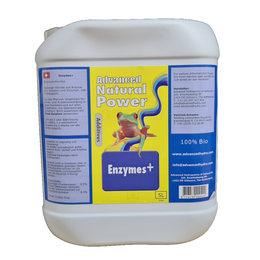 Eine natürliche "Enzyme"-Komponente der Natural Power-Linie aktiviert die begünstigten Mikroorganismen in den Kultursubstraten, was dazu beiträgt, sesshafte Salze zu entfernen und tote Wurzeln abzubauen. Dies verbessert die Fähigkeit der Pflanzen, die Nährstoffe aufzunehmen, und ermöglicht eine gesunde Entwicklung. Die "Enzyme" sind während des grössten Teils der Wachstumszeit der Bewässerung beizufügen und werden von der Mehrheit der erfolgreichen Züchter verwendet.