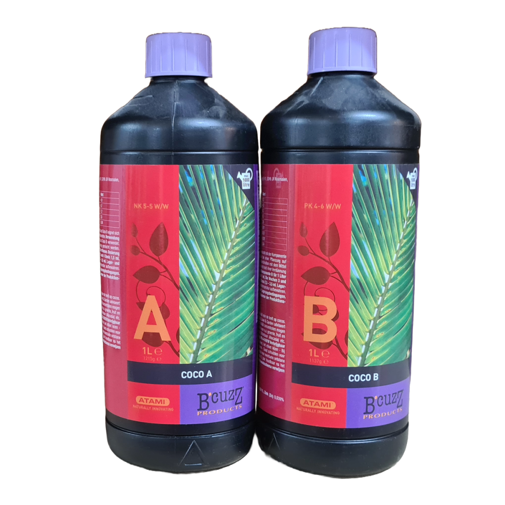 B’cuzz Coco Dünger ist ein 2-Komponentendünger der sowohl während des Wachstum als auch während der Blüte zum Einsatz kommt. Es ist ein hochwertiger und schnell verfügbarer Dünger, der für ein stabiles und biologisches Gleichgewicht in Kokossubstraten sorgt. B’cuzz Coco Nutrients A+B enthält alle notwendigen Nährstoffe für ein optimales Wachstum und eine üppige und reichhaltige Fruchtbildung. Somit eignet sich B’cuzz Coco A+B Dünger für den gesamten Lebenszyklus der Pflanze.