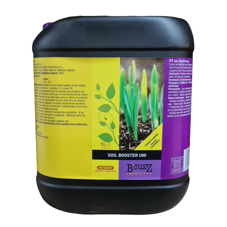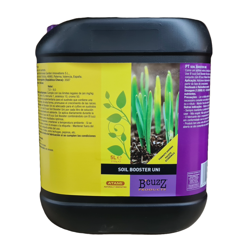 Booster für Pflanzen auf Erde. Enthält Bakterien, Wurzelstimulatoren, Pflanzenextrakte, Enzyme, Zitronensäure und Pflanzenstärkungsmittel