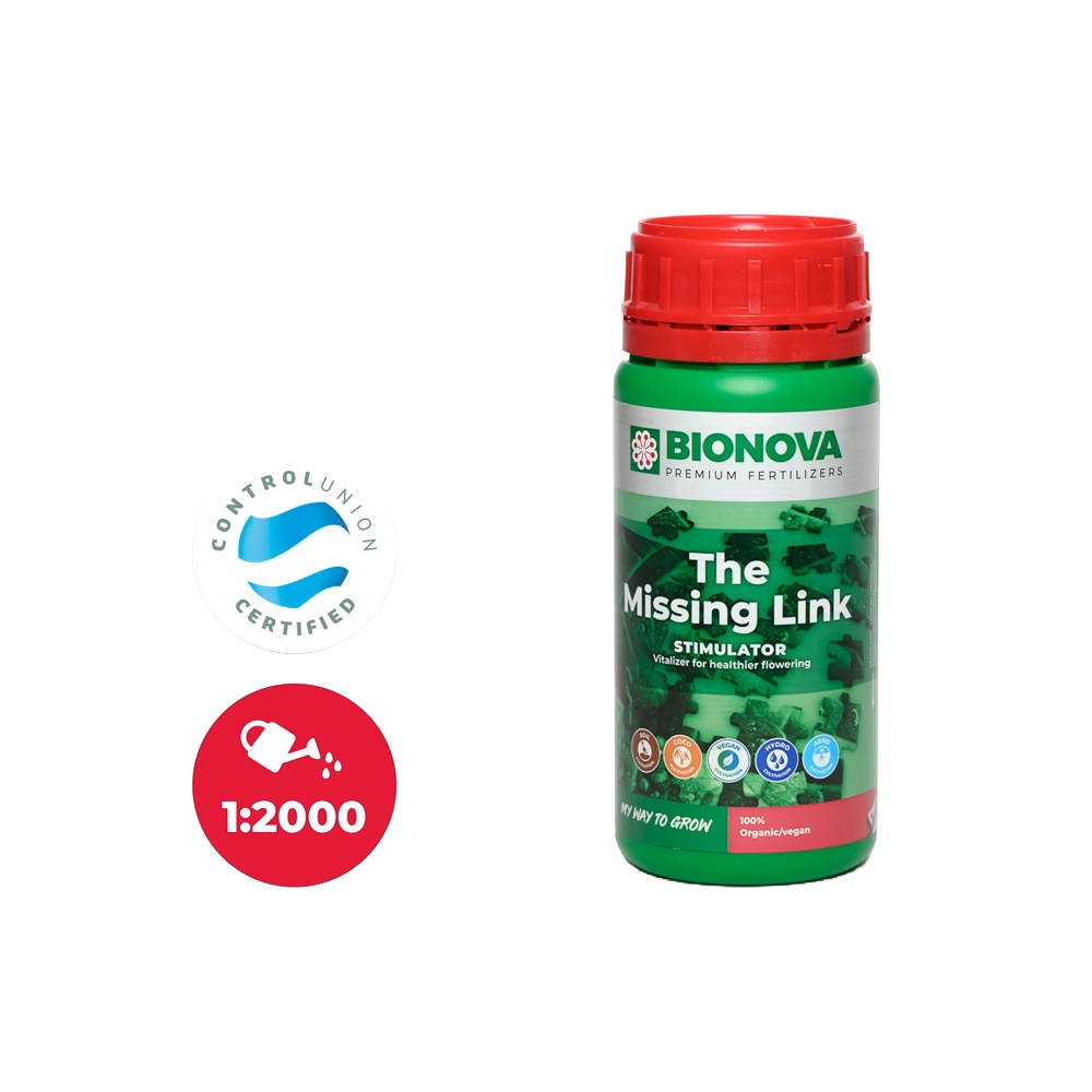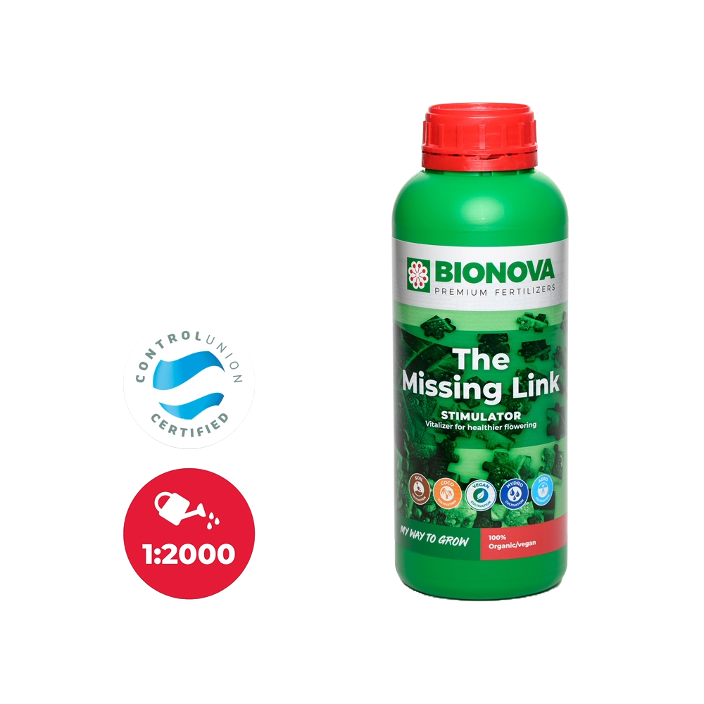 The Missing Link ist ein 100% zertifizierter Bio/Vegan-Stimulator. Die weltweit beste Qualität der Fulvinsäure schafft das ultimative Immunsystem. Dieses ultimative Immunsystem senkt die Stressfaktoren erheblich. Auf diese Weise erreicht die Pflanze ihre volle Erntepotenz. ein kompaktes und vitales Wachstum und reduziert den Bedarf an Pestiziden/Fungiziden. The Missing Link ist ein exklusives Bionova-Produkt für Premium-Grünpflanzen!