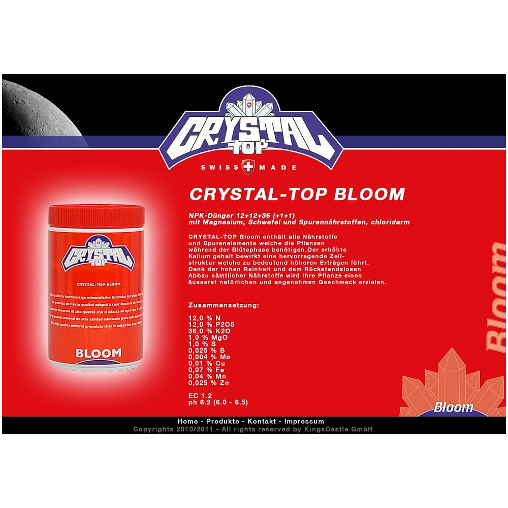 Swiss power plant food. Crystal Top hat sich als 100% wasserlösliches Nährsalz im Gartenbau bewährt. Durch ständige Weiterentwicklung und Verbesserung ist jetzt ein Dünger entstanden, der ein optimales Wachstum und höchste Qualität Ihrer Produkte sichert. Crystal Top zeichnet sich durch seine aussergewöhnlich hohe Reinheit aus. Eine laufende Qualitäts-Überwachung sichert die konstant hohe Qualität von Crystal Top. Der hohe Nitratgehalt gewährleistet eine schnelle Verfügbarkeit und ein gesundes Wurzelwachstum. Ob Tropfbewässerung oder Anstaubewässerung, ob Freiland- oder Gewächshaus-Anbau, Crystal Top bietet für alle Kulturen die richtige Lösung. Crystal Top Nährsalze enthalten ein perfekt abgestimmtes Verhältnis aller Spurenelemente in hochwertiger Gelatform, um ein optimales Wachstum zu gewährleisten. Zur Herstellung der Stammlösung können 1-2 kg Crystal Top auf 10 Liter Wasser gelöst werden. Diese Stammlösung wir dann auf 0,5-1g je Liter verdünnt und den Pflanzen verabreicht. Die Gebrauchslösung kann jederzeit mit Hilfe der Leitfähigkeitsmessung (EC) kontrolliert werden. Vorteile gebenüber herkömmlichen Flüssigdünger Für jedes System geeignet, minimale Versalzung durch qualitativ hochwertige Nährstoffe. Ausgewogene Nährstoffe sorgen für eine harmonische und ertragreiche Blütenbildung. Direkte Aufnahme der Nährstoffe, dank hochwertigen Mineralien und Chelaten. Crystal Top ist ein Volldünger, es sind keine weiteren Zusätze nötig! Kein Wasserschleppen - kleineres Lager, tiefere Transportkosten! Kein Verfallsdatum! Dünger in UV geschütztem Gebinde.