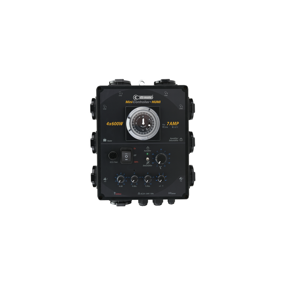 Der Mini-Controller HUMI, MH-Serie, ist für das Schalten von Lampen und Heizung gedacht und steuert die Geschwindigkeit und Versorgung der Ventilatoren entsprechend der Temperatur. Dieser Prototyp kommt auch mit einer Feuchtigkeitskontrolle, mit zwei Modi: Befeuchter und Luftentfeuchter. Er enthält einen doppelten Sensor für Temperatur und Feuchtigkeit.