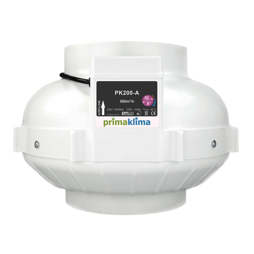 Der Primaklima PK200-A ist ein hocheffizienter Rohrventilator mit einem ebm-papst AC-Motor mit rückwärts gebogenen Blättern, der optimal an das Gehäuse angepasst wurde. Das gesamte Gehäuse ist aus schlagfestem, nicht brennbarem Polyamid (Nylon) hergestellt. Wartungsfreie, langlebige Kugellager tragen zu einem besonders nahtlosen Lauf des Motors bei.