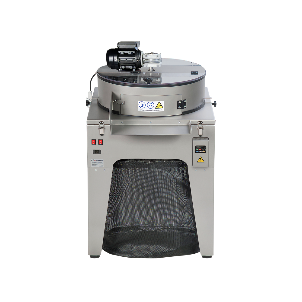 Their leather straps do rotate and move the flowers above the grid. Under the grille are the hardened steel blades which are cutting all the leaves. The inclination of the machine facilitates the exit of the flowers in an effective and smooth way with only open the latch form.