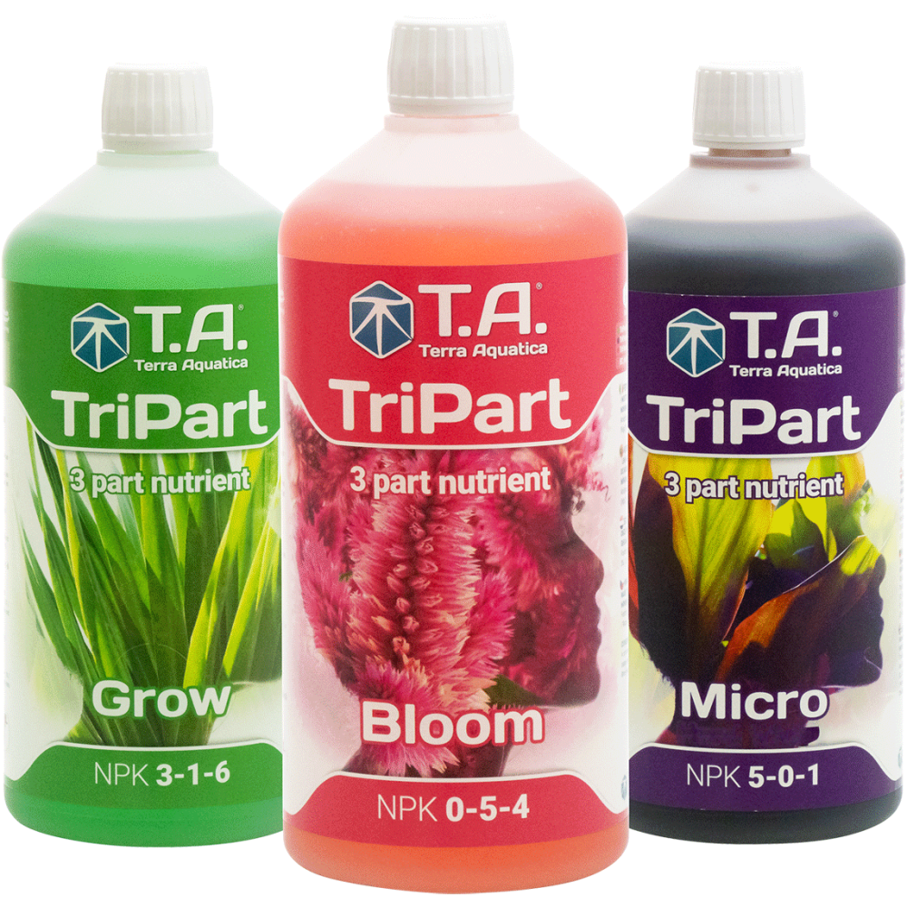 TriPart® Micro: TriPart® Micro ist für hartes und weiches Wasser erhältlich. Als Basiskomponente unseres modularen Düngersystems liefert es Spurenelemente und sonstige Mikronährstoffe und zusätzliche Makronährstoffe. TriPart® Micro in der Wachtsums- und Blütephase gemäß Anwendungshinweisen verabreichen.