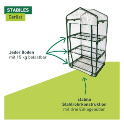 The balcony greenhouse provides optimal conditions for growing and raising herbs, vegetables and ornamental plants – even in the smallest of spaces. The compact construction with three sturdy shelves is ideal for use on a balcony, terrace or in a small city garden.