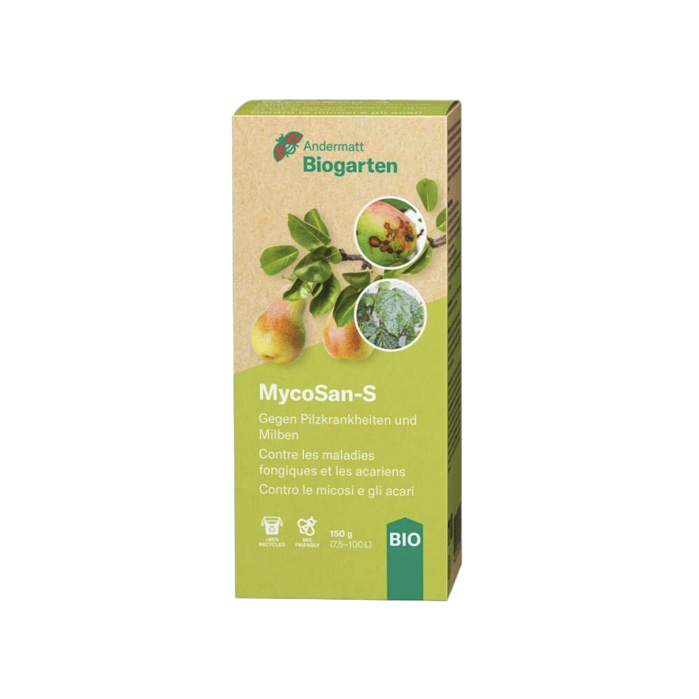 MycoSan-S is a highly effective, biological fungicide and acaricide based on sulfur. It provides reliable protection against fungal diseases such as powdery mildew, scab and shot hole disease, as well as against mite infestations on fruit, berries, vines, vegetables and ornamental plants. Its preventive and direct effect makes it an indispensable tool for keeping plants in gardens and agricultural areas healthy.