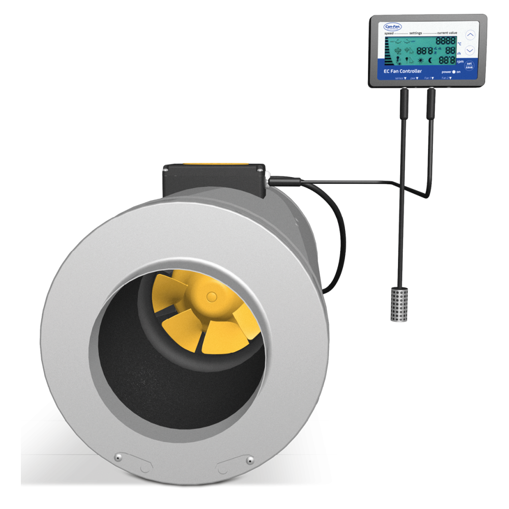 Q-Max series with EC technology is a turbine or mixed flow blower with maximum aerodynamic efficiency and lowest energy consumption due to the new EC technology and the 3D rotor-stator system. The Q-Max EC incorporates a Max Fan Pro Series EC engine in a silencer. Powerful despite the quiet operation of the Q-Max EC is achieved by uniform turbulence-free airflow and the continuous, completely interference-free Plug´n´Play Can-Fan speed or speed and temperature controller. Up to 10 EC fans can be connected and controlled immediately to the Can-Fan EC controller.
