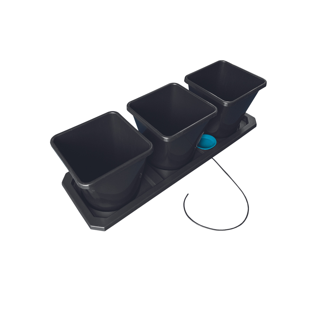 Auto3 XL vous permet dirriguer trois pots solides XL de 25 litres dans un seul ensemble plateau et couvercle qui ne mesure que 114,5 cm x 38,5 cm. Le tout alimenté par une seule AQUAvalve5.