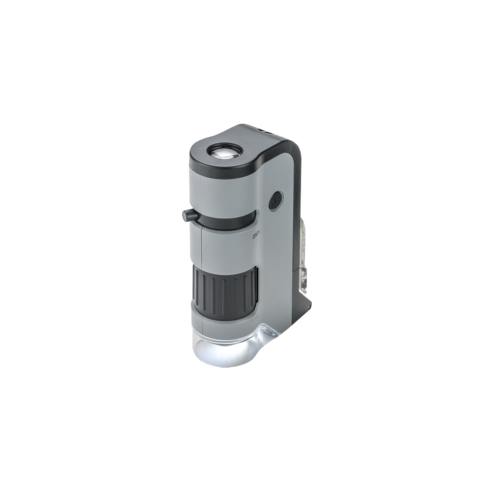 Le Micro Flip est un puissant microscope de poche éclairé avec une base coulissante rabattable et une pince adaptatrice pour Smartphone Digi scoping