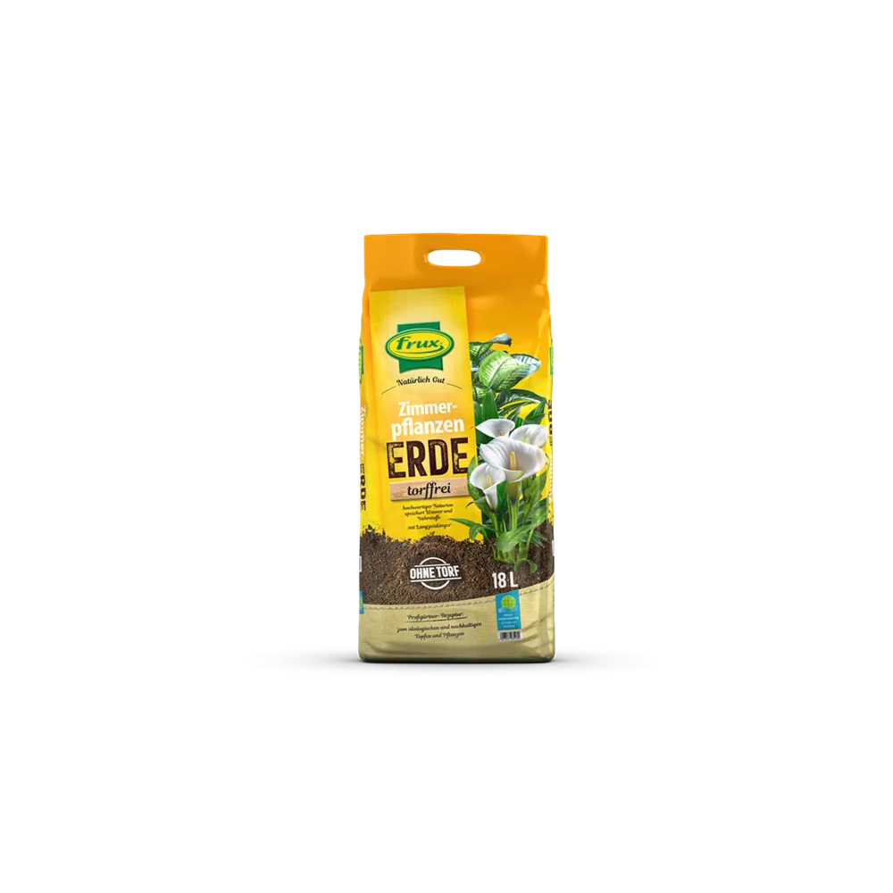 Le terreau pour plantes dintérieur sans tourbe de frux est disponible en sac de 18 litres avec poignée.